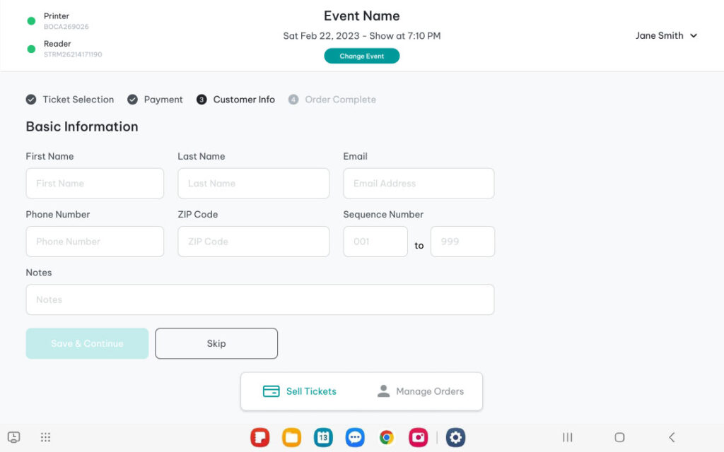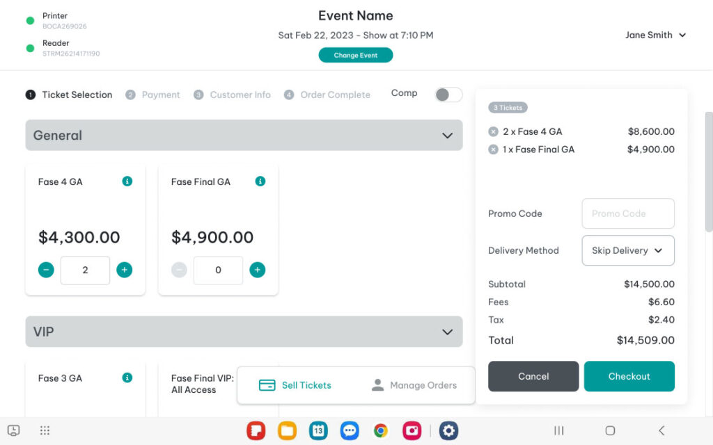 A box office application that enables venue and festival staff to efficiently sell tickets onsite, manage existing orders, and fulfill will-call pickups. Designed for fast, reliable performance in high-traffic environments, the app streamlines core box office workflows—including ticket sales, order lookup, and issuing tickets to will-call customers—ensuring smooth, accurate, and professional onsite operations.