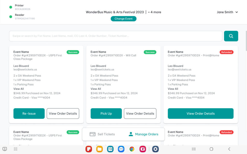 Manage Orders screen that displays all orders with key information at a glance (e.g., customer name, order number, tickets purchased, payment status), and provides a quick-action button to view full order details. Efficiently locate, review, and resolve customer needs during onsite operations.